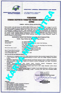 • .Pengakuan Sebagai Eksportir Terdaftar Produk Industri Kehutanan (ETPIK) Nomor. 1455-Rev.3/DAGLU/ETPIK/VII/2011 Tanggal 28 Juli 2011 Untuk Kayu Olahan dan Mebel dari Kayu & Rotan Atas Nama CV. Karya Mina Putra.