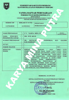 • Kepanitraan Pengadilan Negeri Rembang Register nomor. W.9.Dj.Ht.01.01.28.2005 tanggal 07 Juli 2005 tentang Pengesahan akta perubahan anggaran dasar CV. Karya Mina Putra.